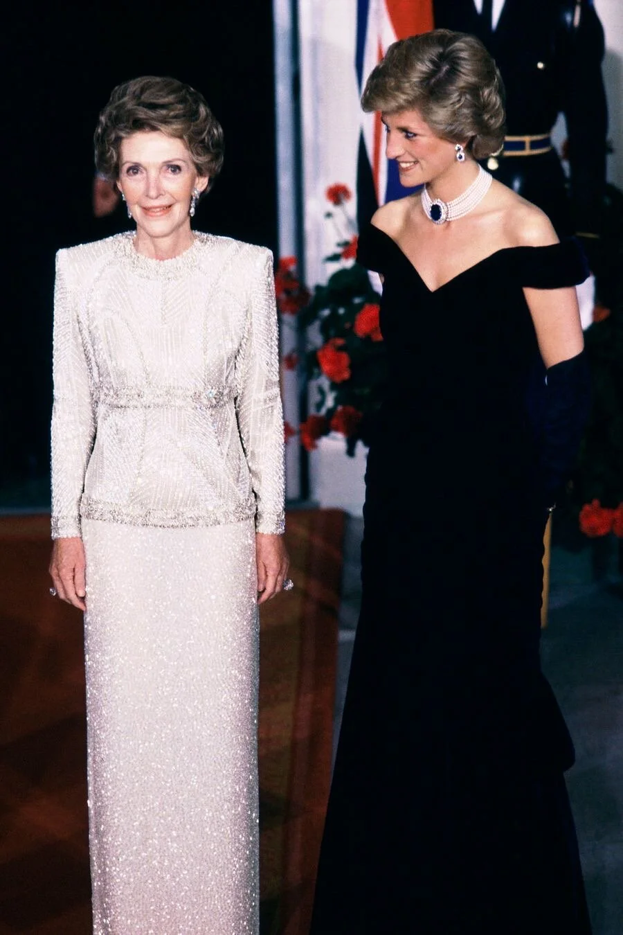 Welcoming Princess Diana to the White House in 1985 wearing a dress by Victor Edelstein.